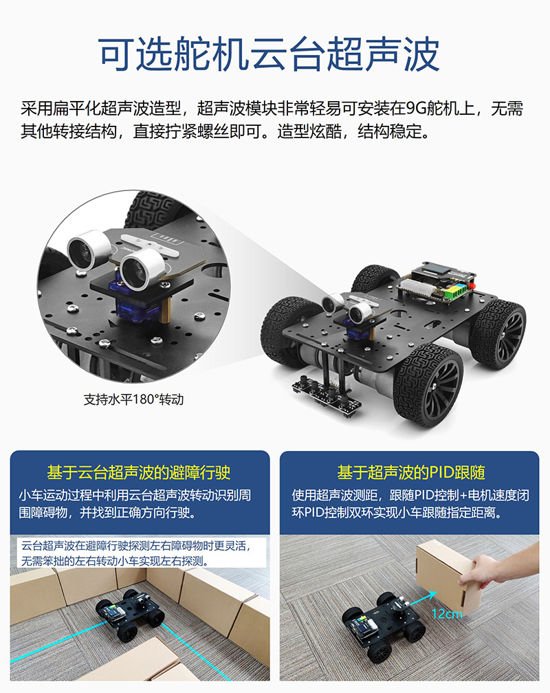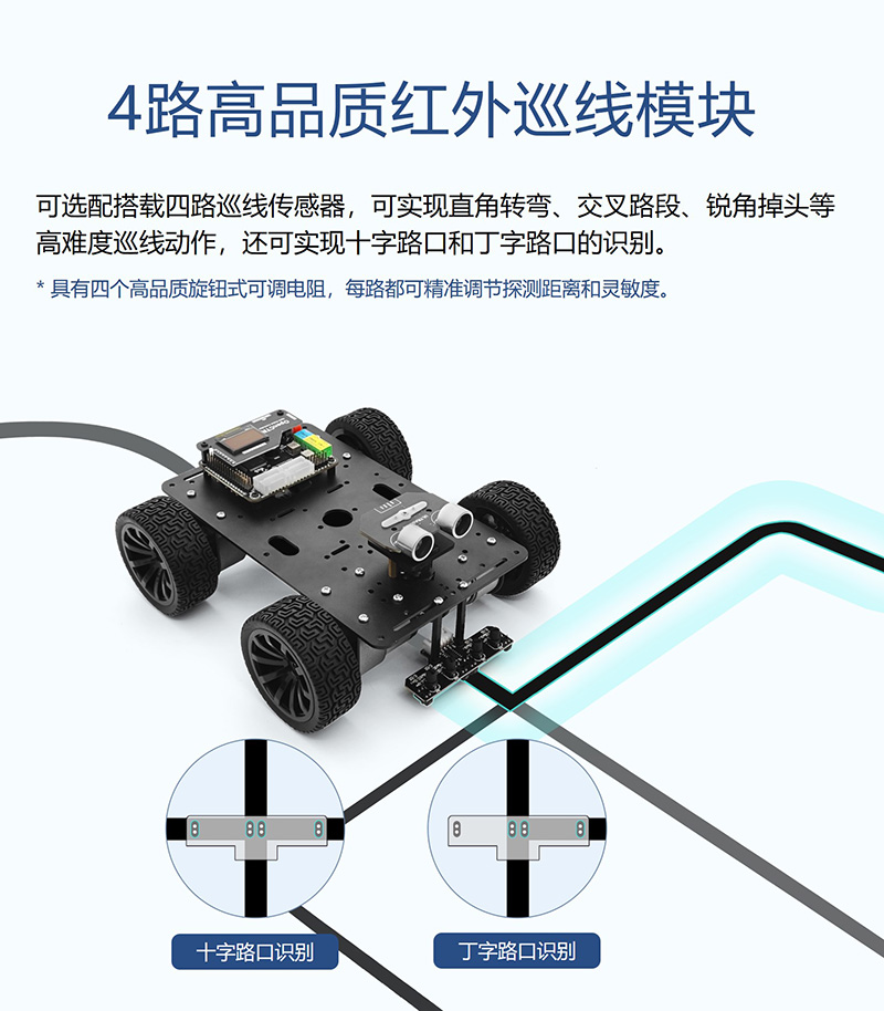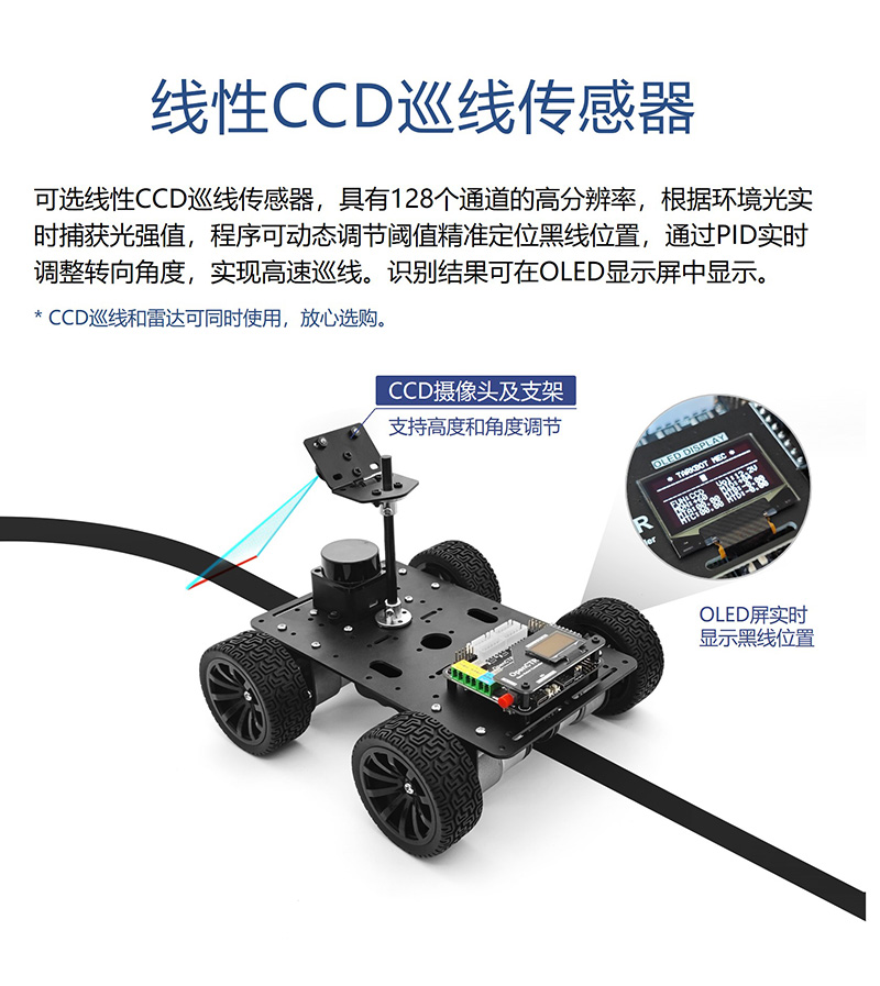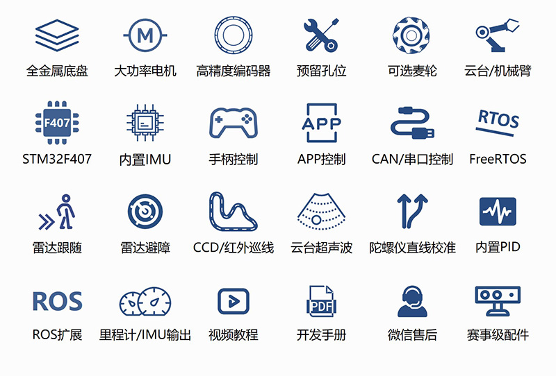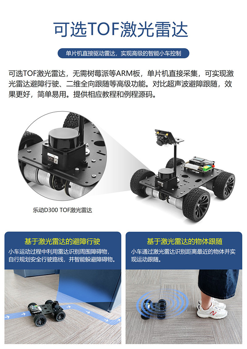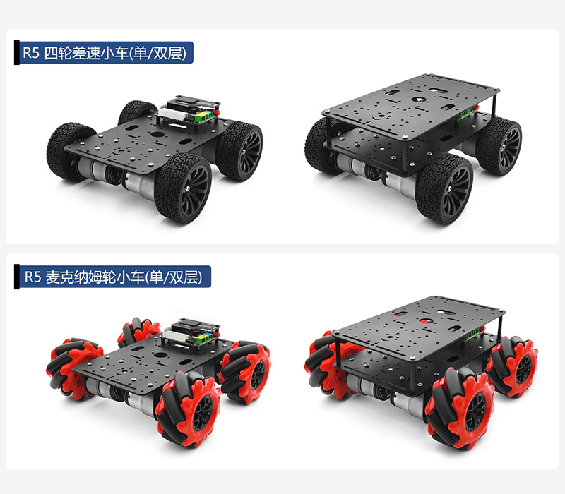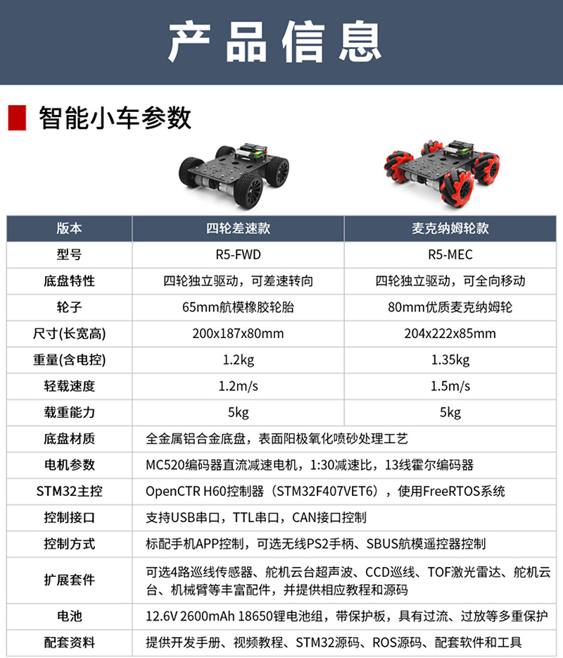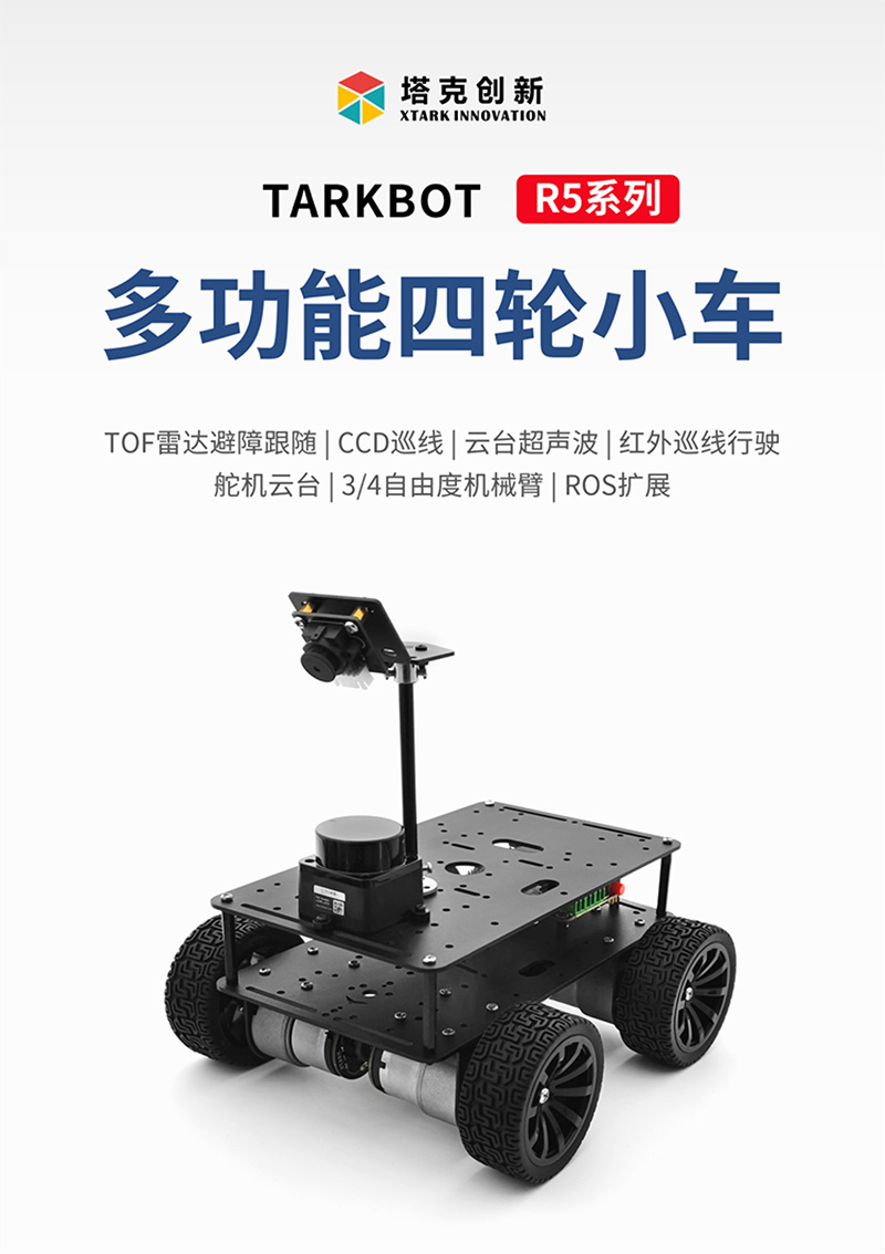 產(chǎn)品簡介:TARKBOT R5系列四輪/麥輪小車是塔克創(chuàng)新面向大學生電子設計競賽/DIY小車/學科實訓教學場景開發(fā)的多功能智能小車。搭載520大功率高精度霍爾編碼器減速電機,全金屬底盤,負載可達5kg,適合各類小車賽事。主控采用STM32F407VET6,支持PS2手柄、手機藍牙APP、航模遙控器控制,可選四路紅外巡線模塊、CCD巡線模塊、云臺超聲波避障、TOF雷達避障跟隨、舵機云臺、機械臂等豐富配件。支持ROS擴展,可通過USB串口、TTL串口、CAN接口控制,提供視頻教程和源碼,支持二次開發(fā)。