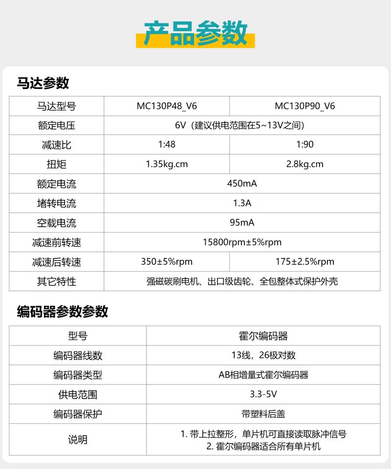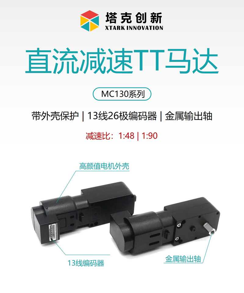 產品簡介:直流減速TT馬達帶外殼保護,顏值高;13線26極編碼器,精度高,多減速比可選;金屬輸出軸,品質高耐用,可適配多款智能小車底盤。