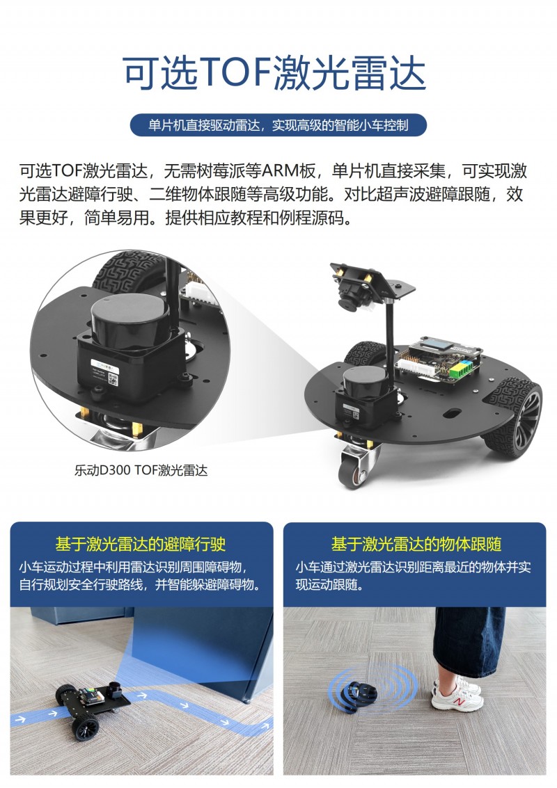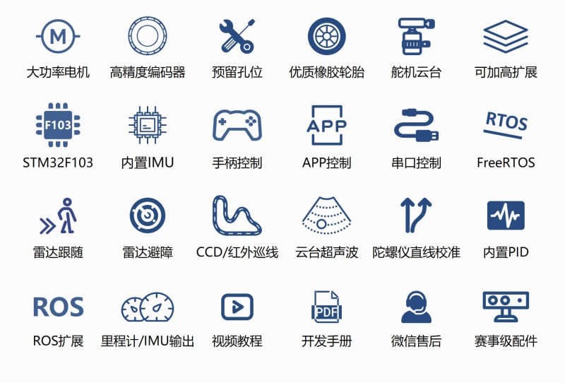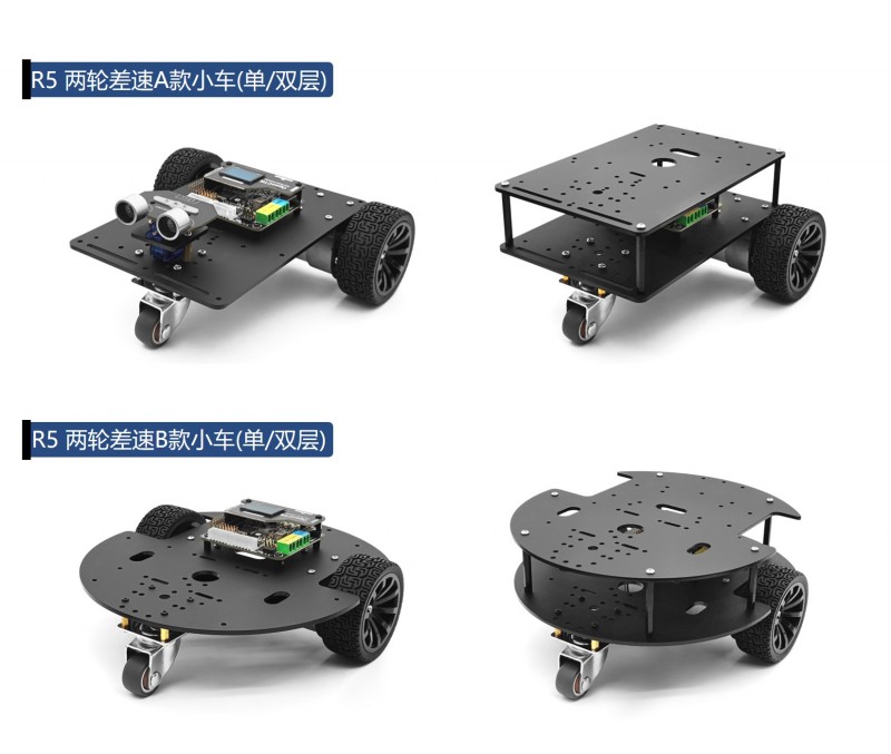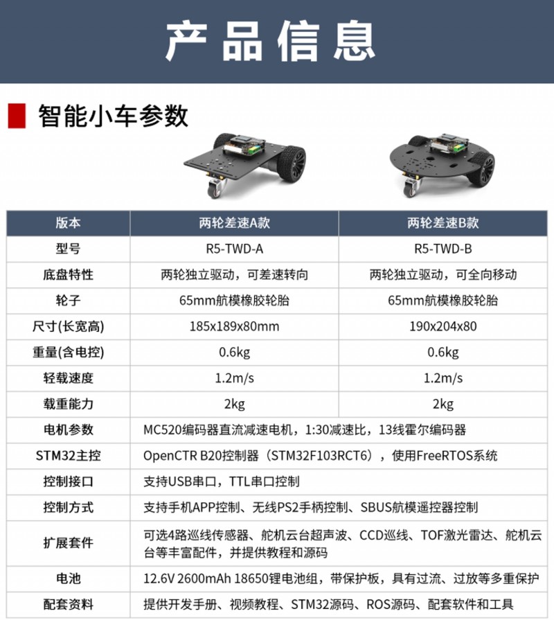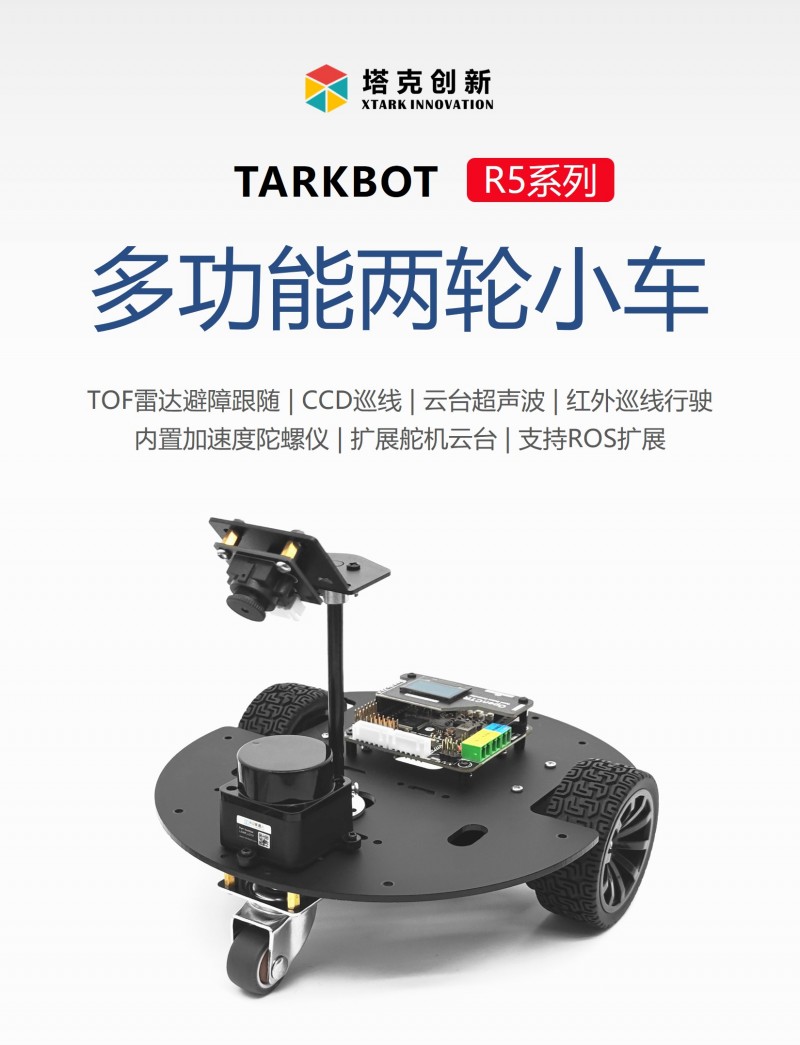 產品簡介: TARKBOT R5系列兩輪小車是塔克創新面向大學生電子設計競賽/DIY小車/學科實訓教學場景開發的多功能智能小車。主控采用STM32F103RCT6,內置IMU加速度陀螺儀傳感器,搭載520大功率霍爾編碼器電機。小車支持PS2手柄、手機藍牙APP、航模遙控器控制,可選四路紅外巡線模塊、CCD巡線模塊、云臺超聲波避障、TOF雷達避障跟隨、舵機云臺等豐富配件。支持ROS擴展,可通過USB串口、TTL串口控制,提供視頻教程和源碼,支持二次開發,特別適合各類小車賽事。