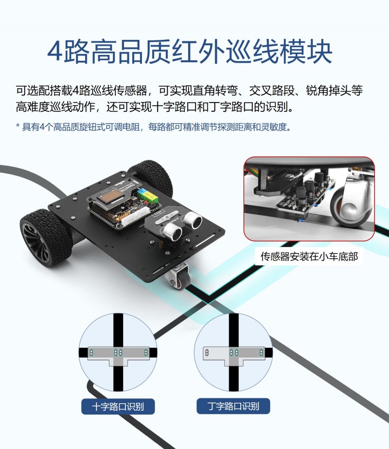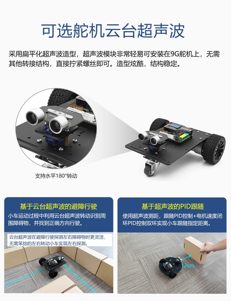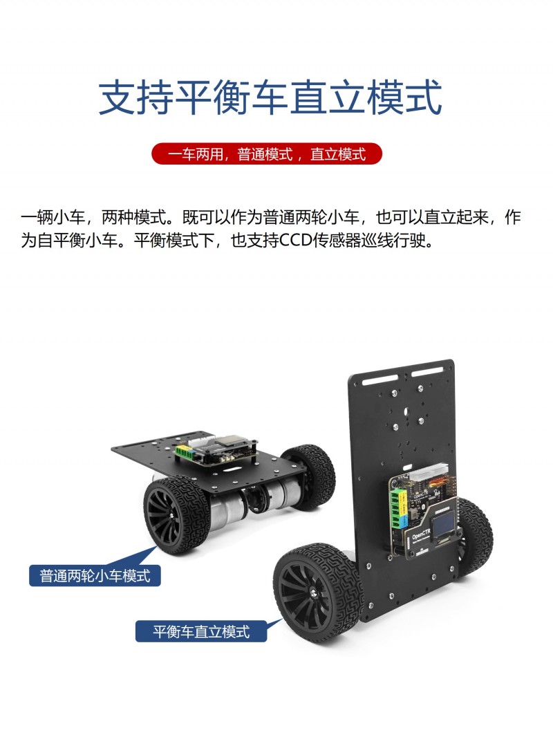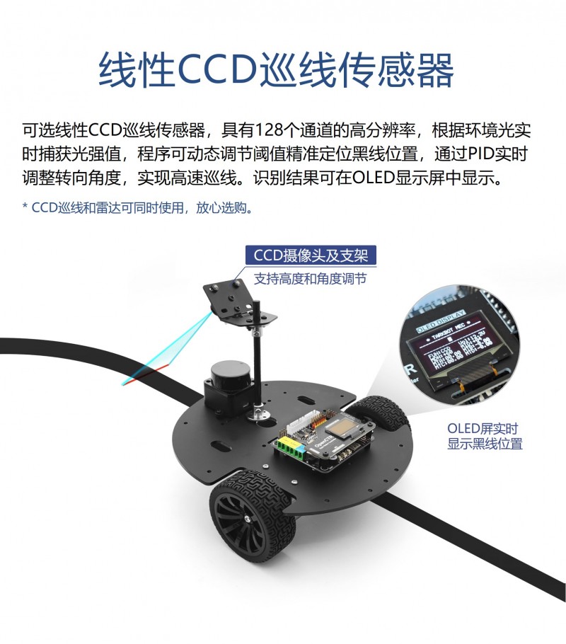 產品簡介: TARKBOT R5系列兩輪小車是塔克創新面向大學生電子設計競賽/DIY小車/學科實訓教學場景開發的多功能智能小車。主控采用STM32F103RCT6,內置IMU加速度陀螺儀傳感器,搭載520大功率霍爾編碼器電機。小車支持PS2手柄、手機藍牙APP、航模遙控器控制,可選四路紅外巡線模塊、CCD巡線模塊、云臺超聲波避障、TOF雷達避障跟隨、舵機云臺等豐富配件。支持ROS擴展,可通過USB串口、TTL串口控制,提供視頻教程和源碼,支持二次開發,特別適合各類小車賽事。