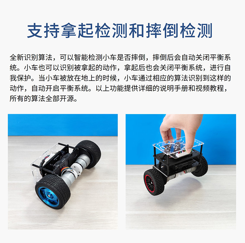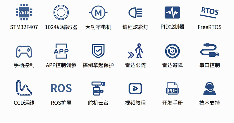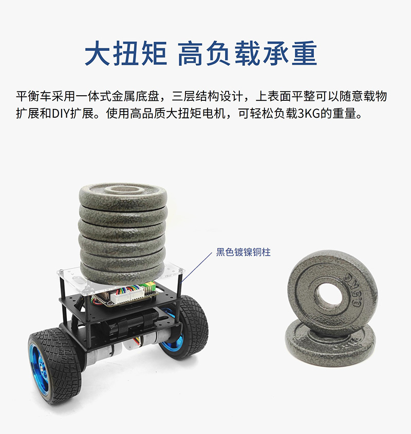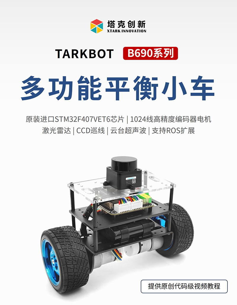產品簡介:TARKBOT B690系列平衡小車采用一體化金屬底盤設計,520大功率編碼器電機,負載可達3KG。采用驅控一體式控制器OpenCTR H60(STM32F407VET6) ,小巧緊湊,內置IMU加速度陀螺儀傳感器,具有酷炫RGB編程彩燈。小車支持PS2無線手柄、藍牙APP控制、航模遙控器控制,支持CAN總線控制,支持STM32直接連接激光雷達實現避障跟隨功能,支持CCD高速巡線功能,可擴展舵機云臺。提供專業串口波形調試軟件,方便PID調試。小車支持通過USB串口進行ROS擴展。使用自己的樹莓派等主控可快速制作ROS自平衡機器人。提供ROS驅動包源碼、開發手冊和視頻教程,方便二次開發。