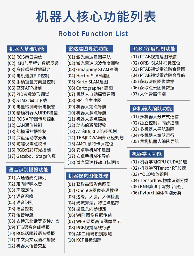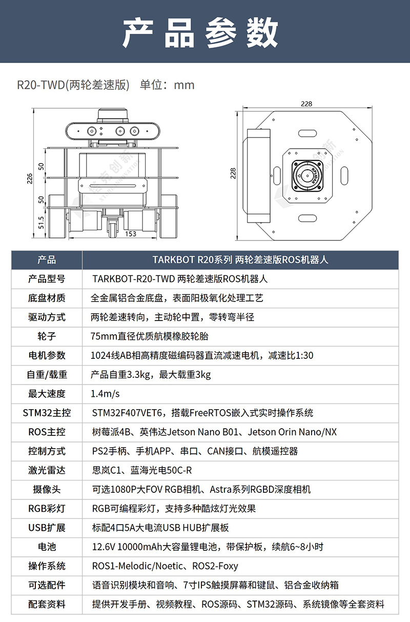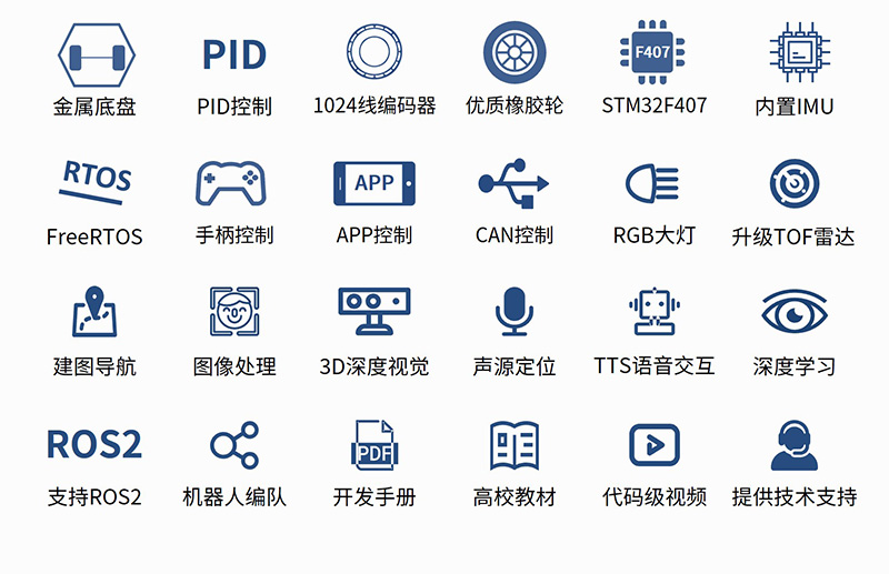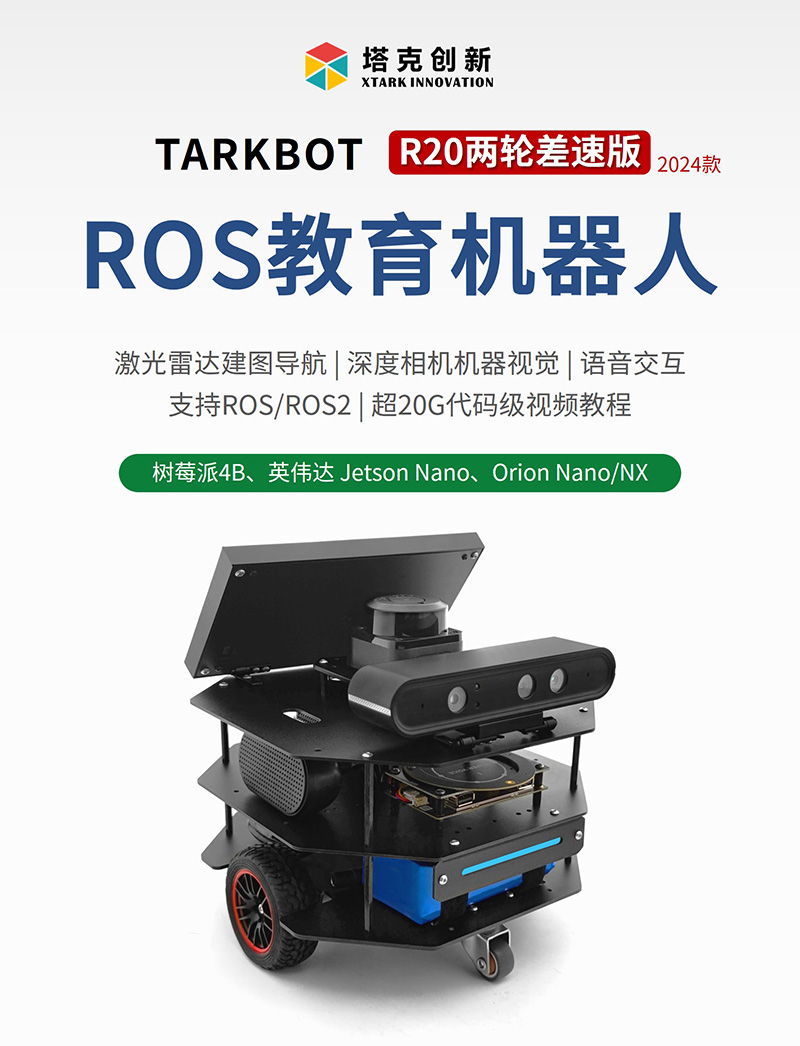 產品簡介:塔克創新TARKBOT R20系列是針對ROS教育科研的旗艦產品,支持主流的樹莓派4B、英偉達Jetson Nano、Orion Nano/NX系列主控,支持ROS1和ROS2系統。具有1024線高精度編碼器,STM32F407主控,酷炫可編程RGB彩燈,搭載奧比中光深度相機、激光雷達、語音交互配件。可實現機器人運動控制、SLAM建圖導航、機器視覺、3D視覺、語音控制、跟隨避障、多機器人編隊等功能,提供800+頁手冊和200+源碼級中英字幕視頻教程,提供技術支持,可零基礎入門和進階學習。