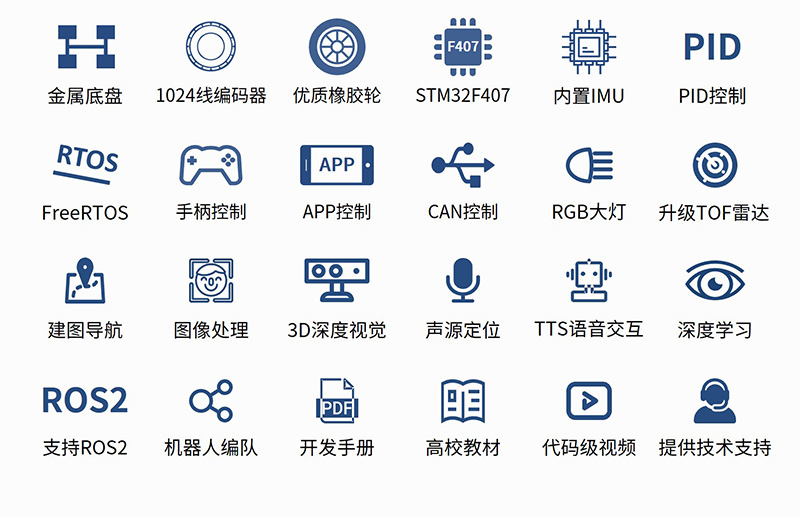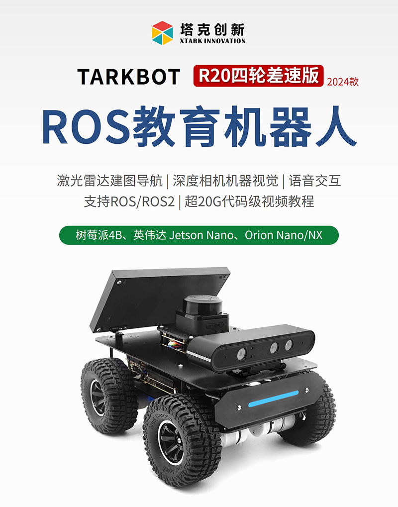 產(chǎn)品簡(jiǎn)介:塔克創(chuàng)新TARKBOT R20系列是針對(duì)ROS教育科研的旗艦產(chǎn)品,支持主流的樹(shù)莓派4B、英偉達(dá)Jetson Nano、Orion Nano/NX系列主控,支持ROS1和ROS2系統(tǒng)。具有1024線(xiàn)高精度編碼器,STM32F407主控,酷炫可編程RGB彩燈,搭載奧比中光深度相機(jī)、激光雷達(dá)、語(yǔ)音交互配件。可實(shí)現(xiàn)機(jī)器人運(yùn)動(dòng)控制、SLAM建圖導(dǎo)航、機(jī)器視覺(jué)、3D視覺(jué)、語(yǔ)音控制、跟隨避障、多機(jī)器人編隊(duì)等功能,提供800+頁(yè)手冊(cè)和200+源碼級(jí)中英字幕視頻教程,提供技術(shù)支持,可零基礎(chǔ)入門(mén)和進(jìn)階學(xué)習(xí)。