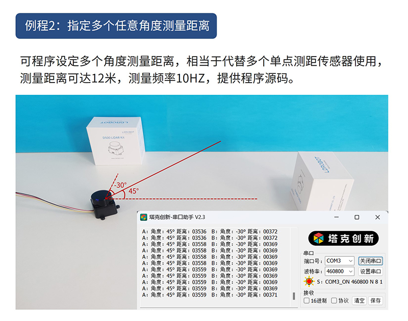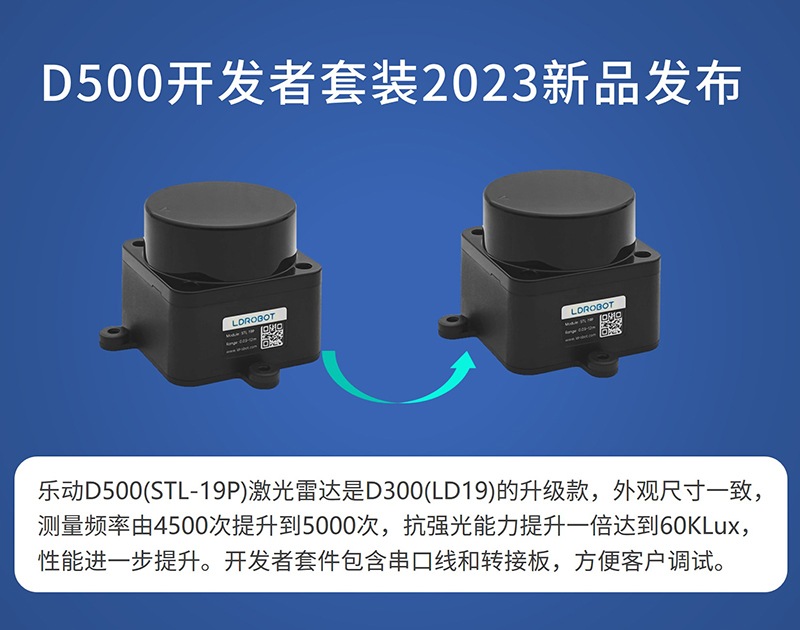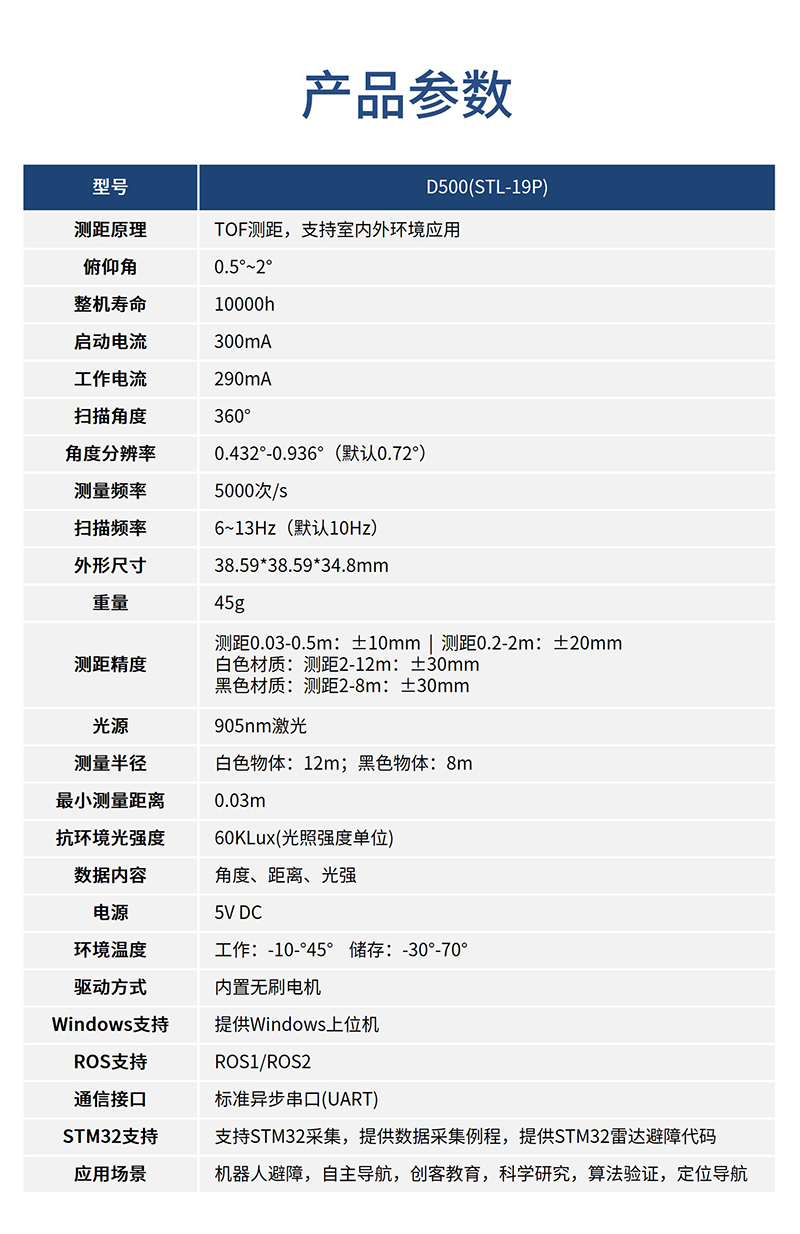 產(chǎn)品簡介:樂動(dòng)D500(STL-19P)激光雷達(dá)是D300(LD19)的升級款,外觀尺寸一致,測量頻率由4500次提升到5000次,抗強(qiáng)光能力提升一倍達(dá)到60KLux,性能進(jìn)一步提升。開發(fā)者套件包含串口線和轉(zhuǎn)接板,方便客戶調(diào)試。尺寸小巧,12米米測距半徑,每秒5000次測量頻率,內(nèi)置無刷電機(jī),360°無遮擋,定位精度高,建圖效果好,可抗60KLux環(huán)境強(qiáng)光,有效防止日光干擾。